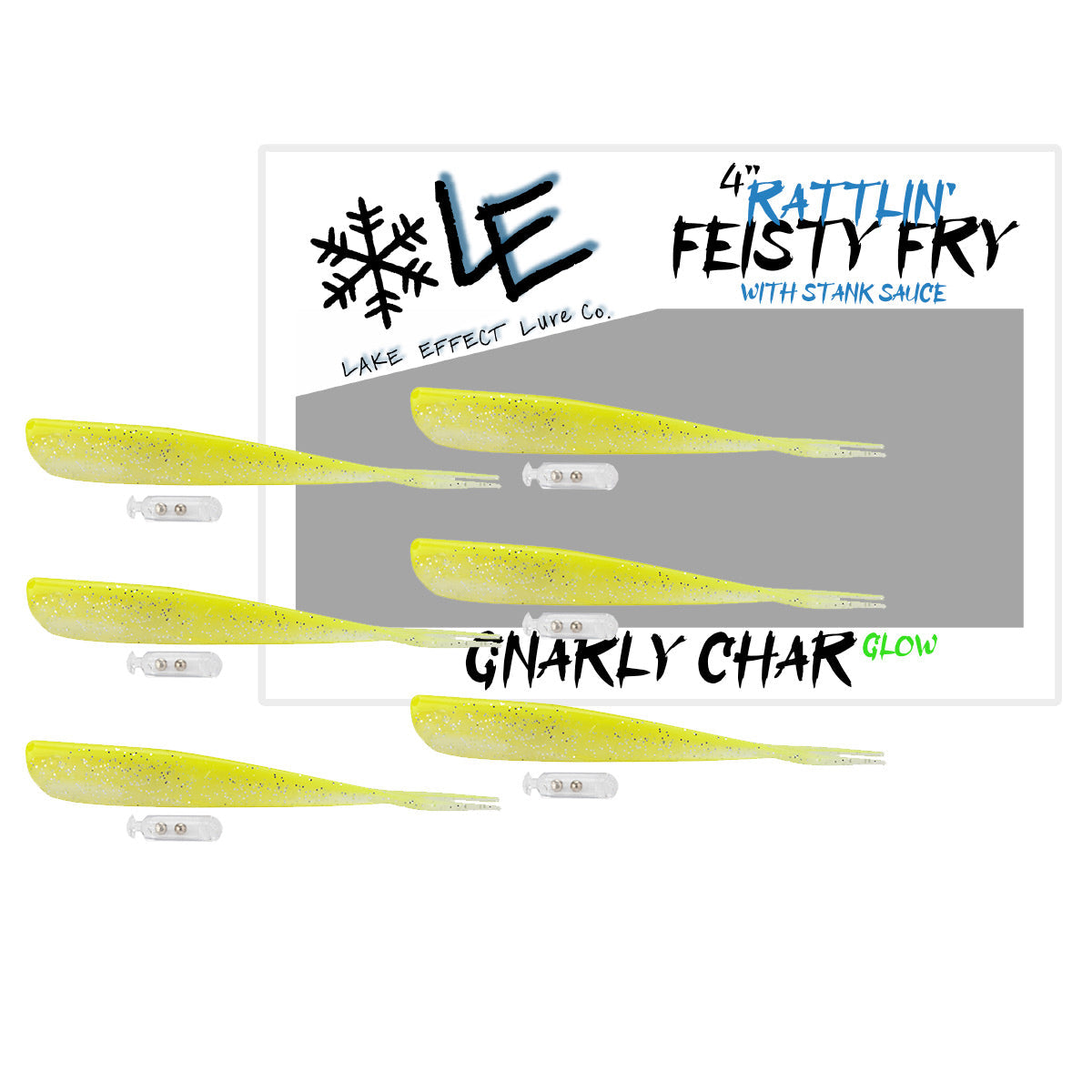 This combo contains 2 packs of every Feisty Fry we make, 1 pack of each size! Both 3” and 4”! That’s a total of 96 Rattlin’ Soft Plastics!! Our super flexible, yet extremely durable soft plastic formula blows the competition away! Plus, Our Feisty Fry come complete with: